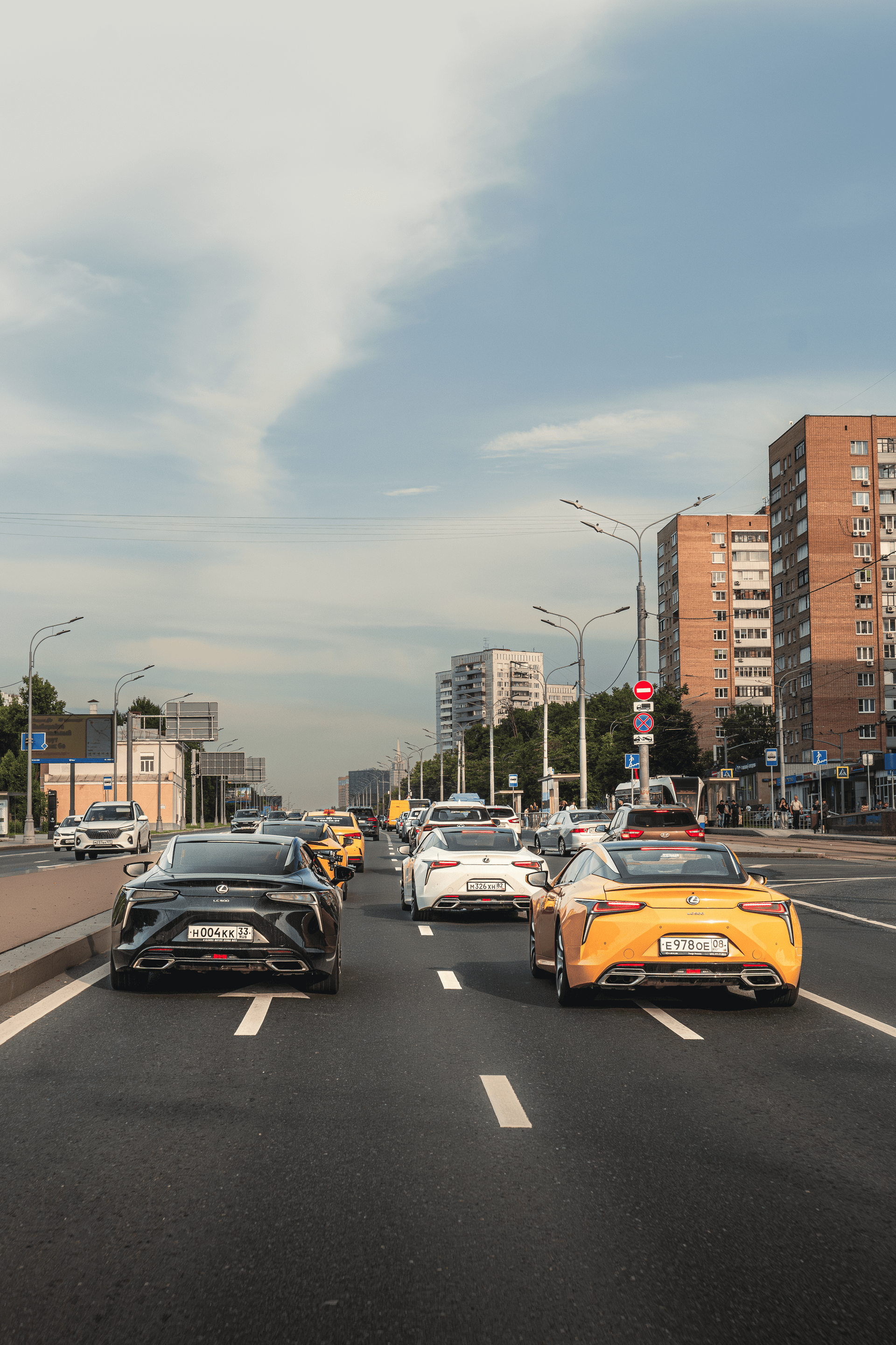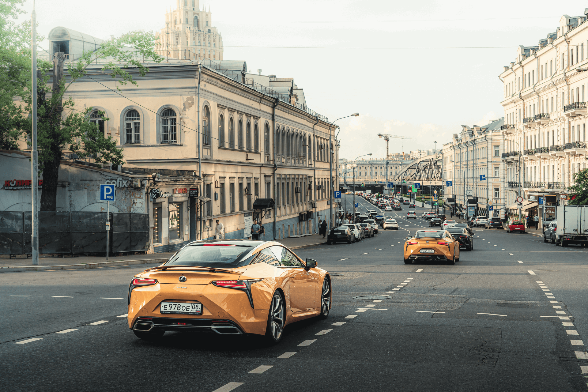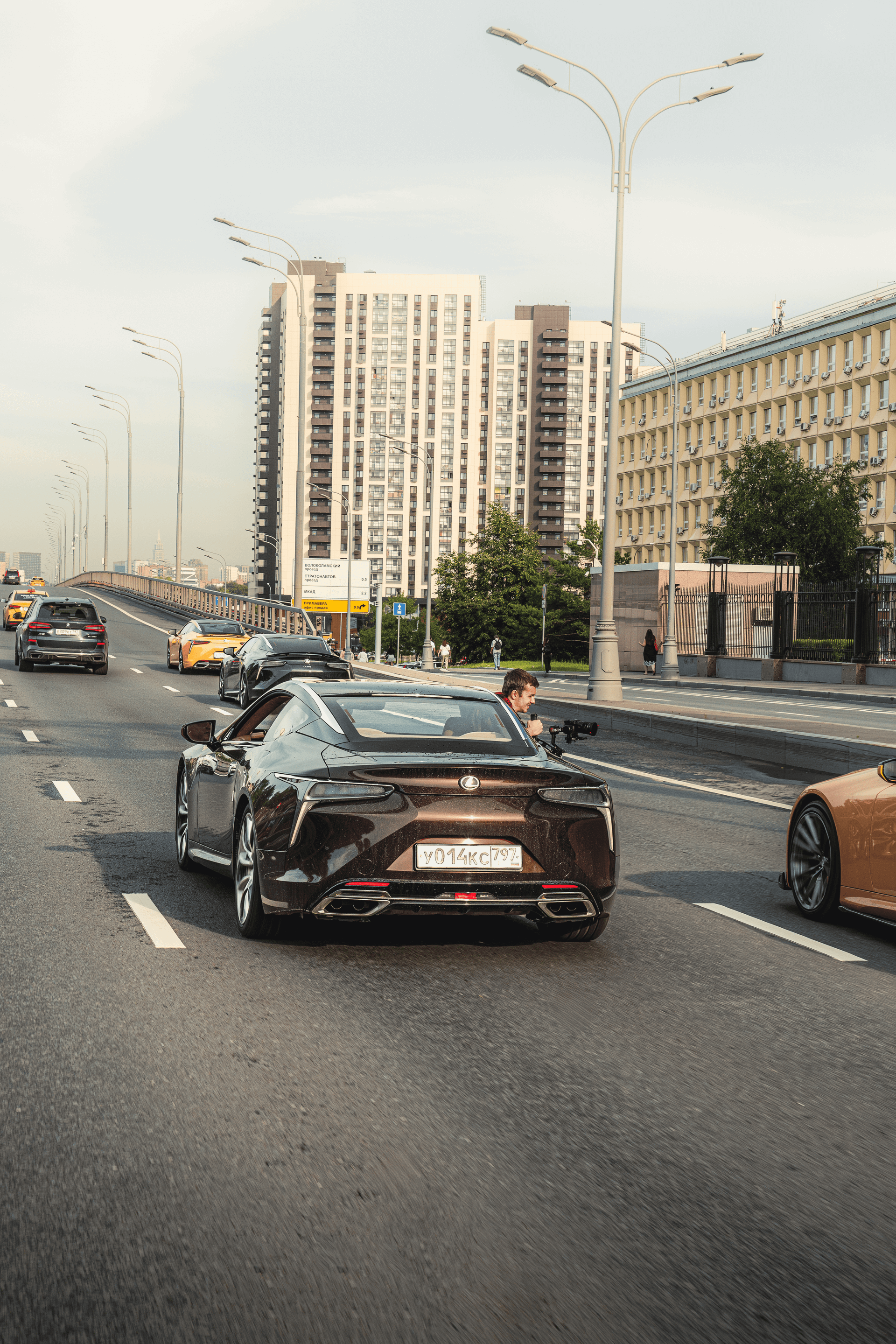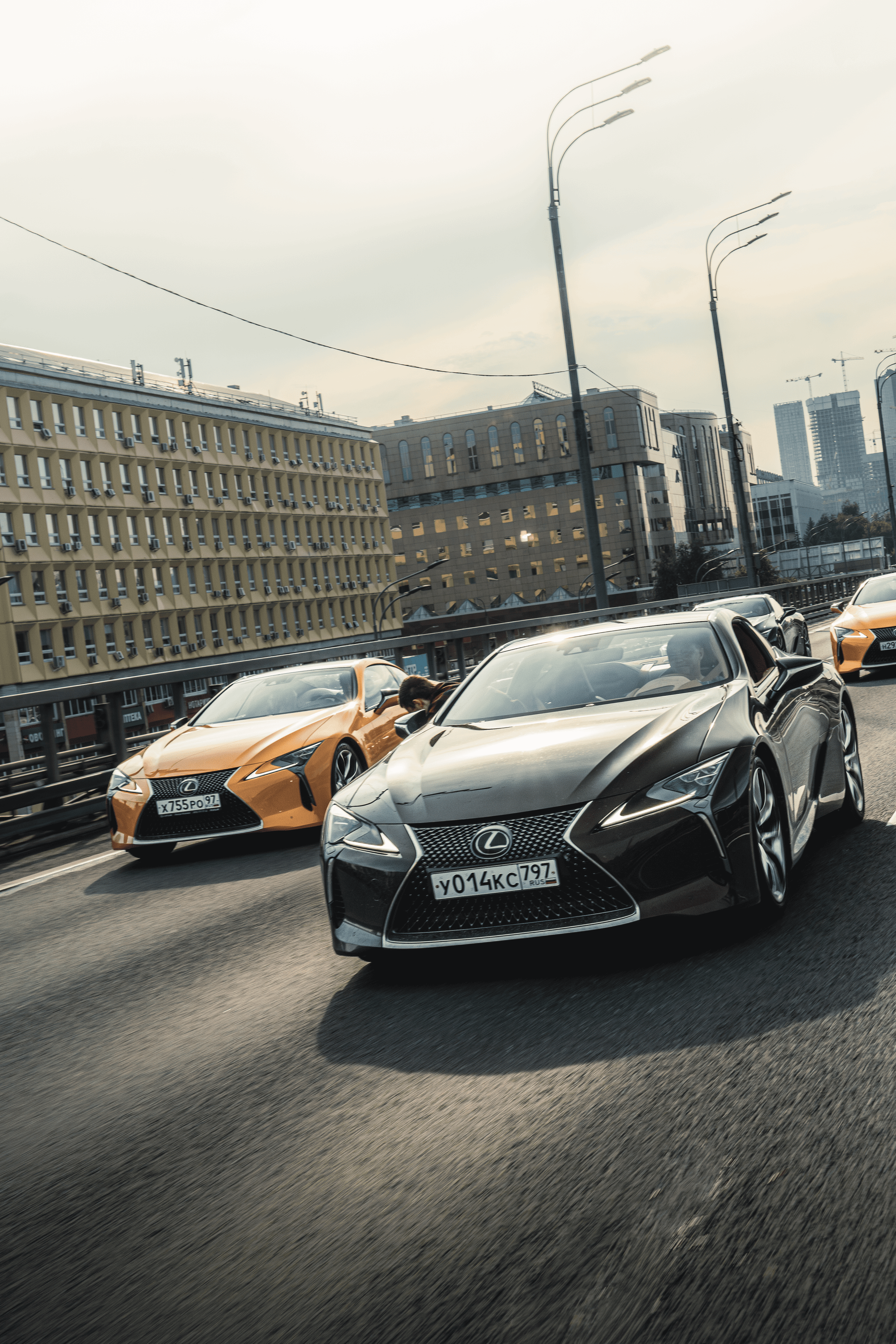Чтобы запечатлеть картину восьми LC500, едущих по Москве, я заранее пересел в Mercedes G63 одного из участников клуба — его Lexus, к сожалению, не успели подготовить к встрече. Благодаря большим окнам G-класса мне удалось сделать фото с разных ракурсов, почти не высовываясь наружу. Во время поездки колонна несколько раз случайно разделялась, но благодаря небольшой загруженности улиц и высокой скорости движения нам удавалось быстро собираться обратно.