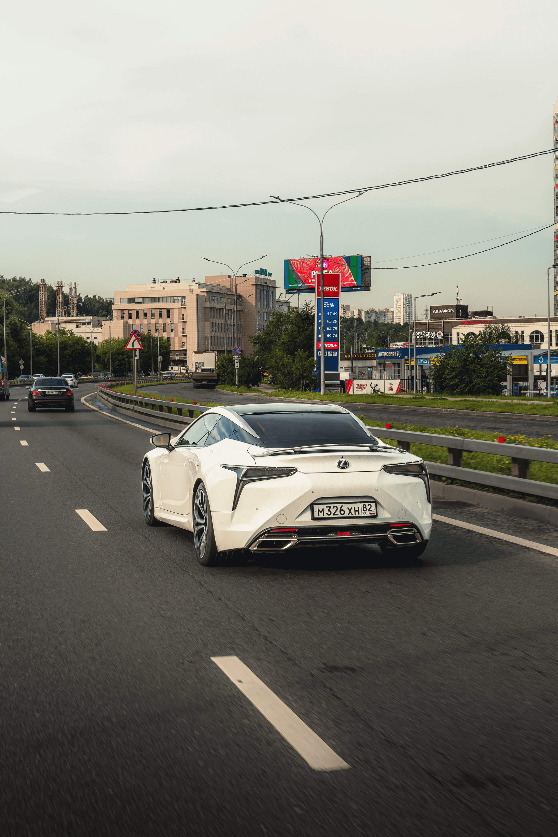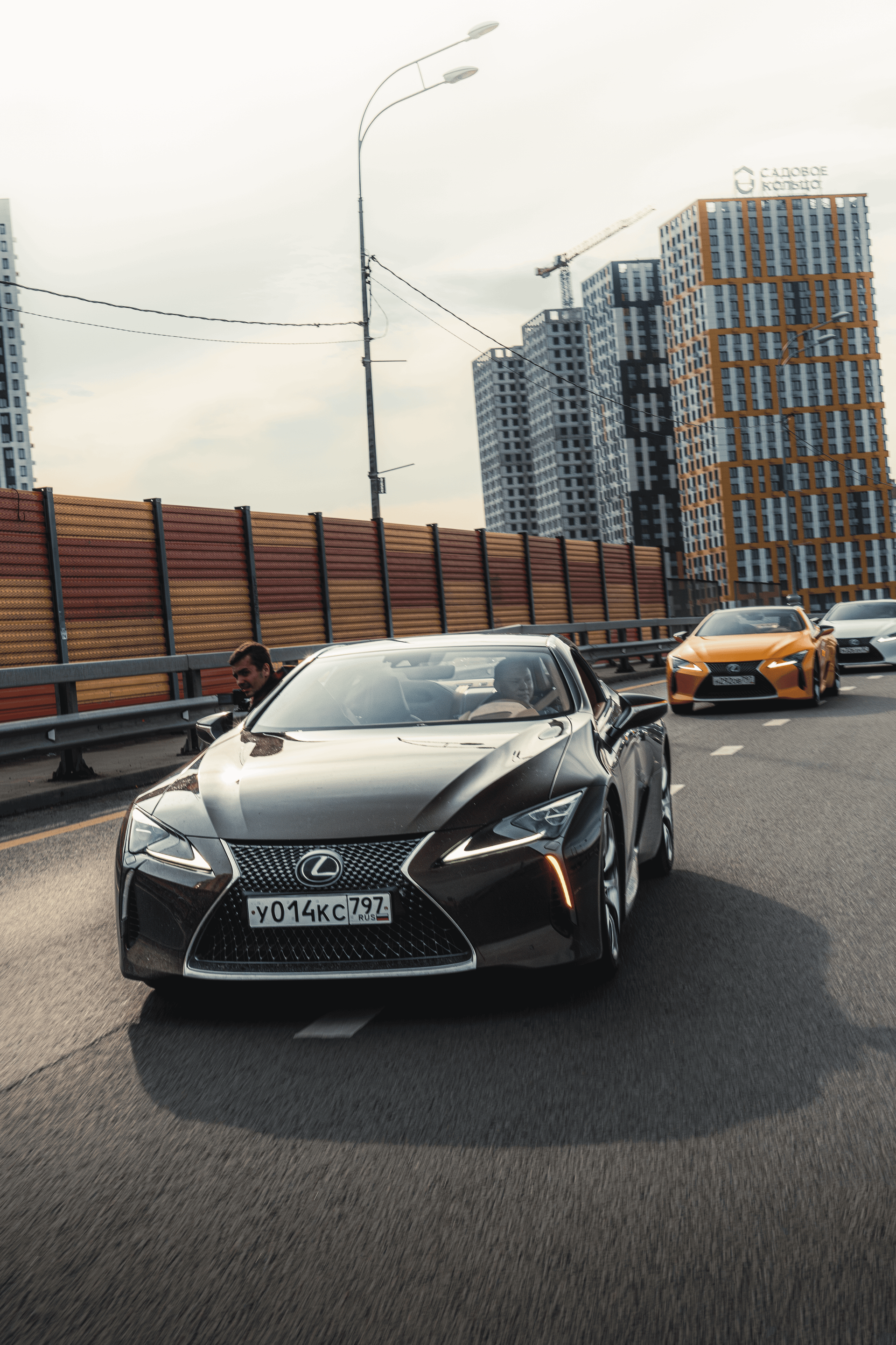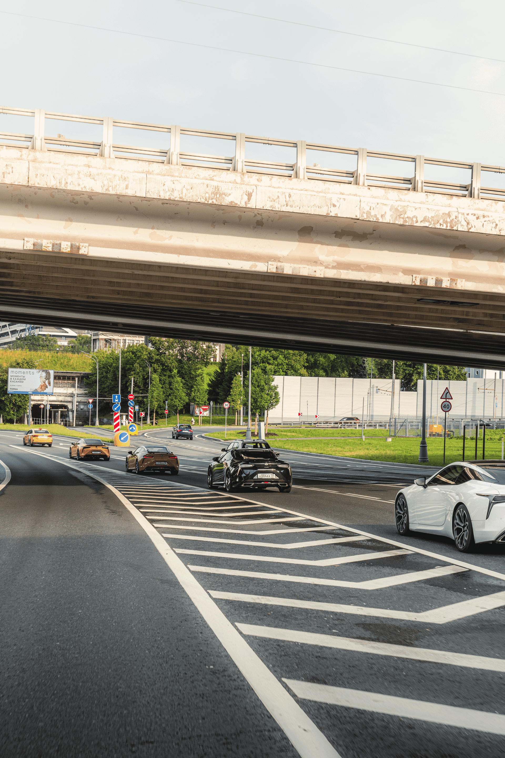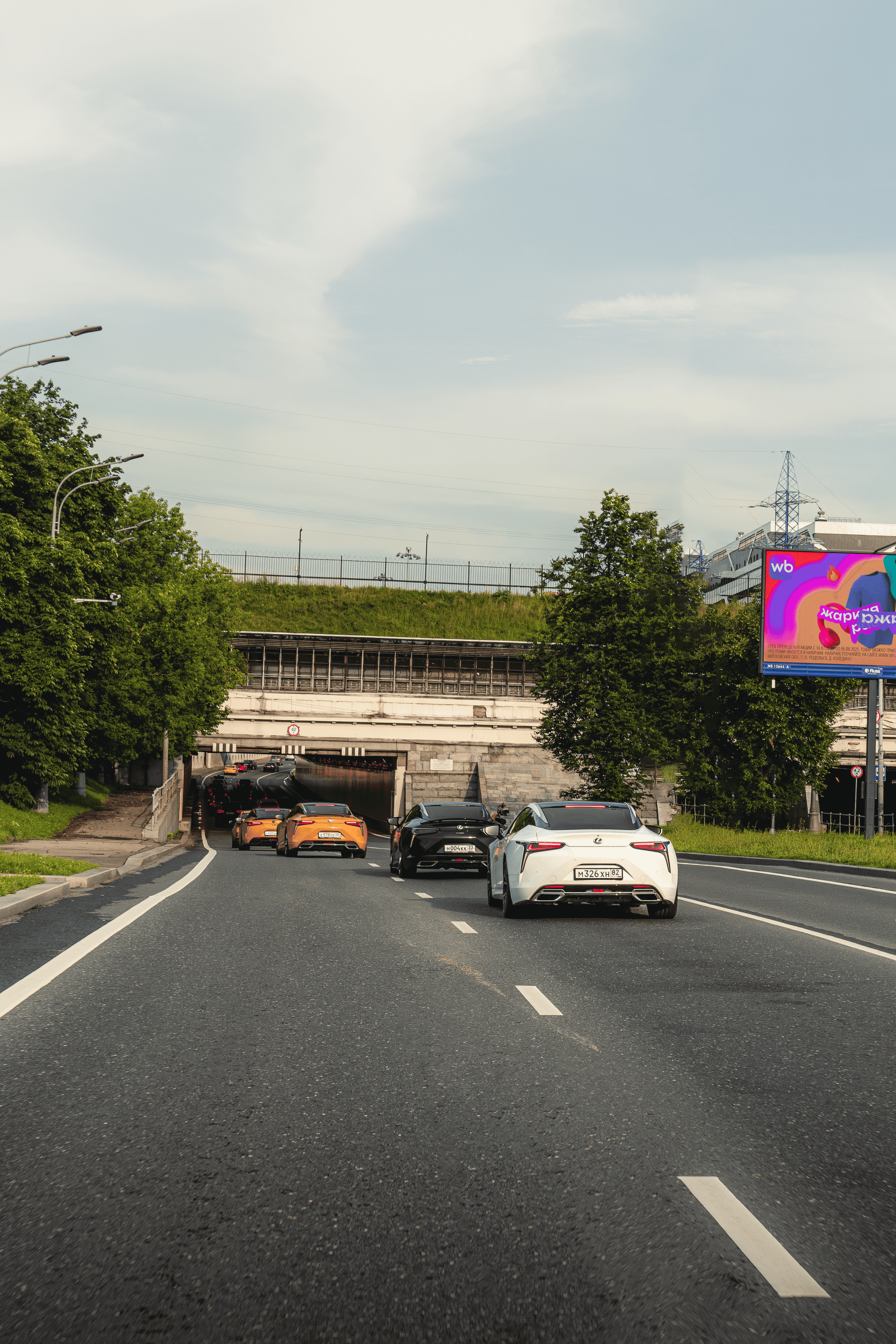 Чтобы запечатлеть картину восьми LC500, едущих по Москве, я заранее пересел в Mercedes G63 одного из участников клуба — его Lexus, к сожалению, не успели подготовить к встрече. Благодаря большим окнам G-класса мне удалось сделать фото с разных ракурсов, почти не высовываясь наружу. Во время поездки колонна несколько раз случайно разделялась, но благодаря небольшой загруженности улиц и высокой скорости движения нам удавалось быстро собираться обратно.