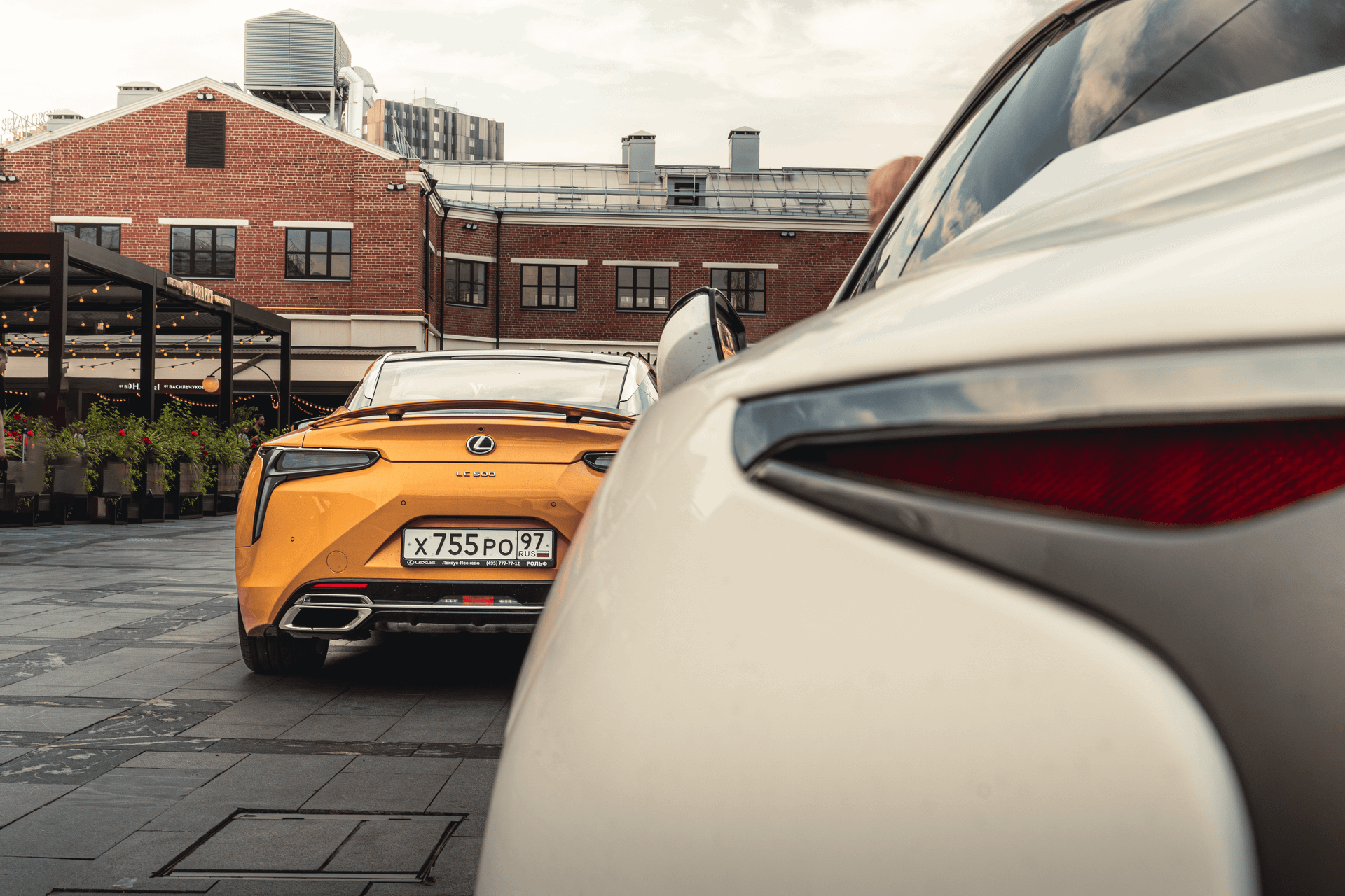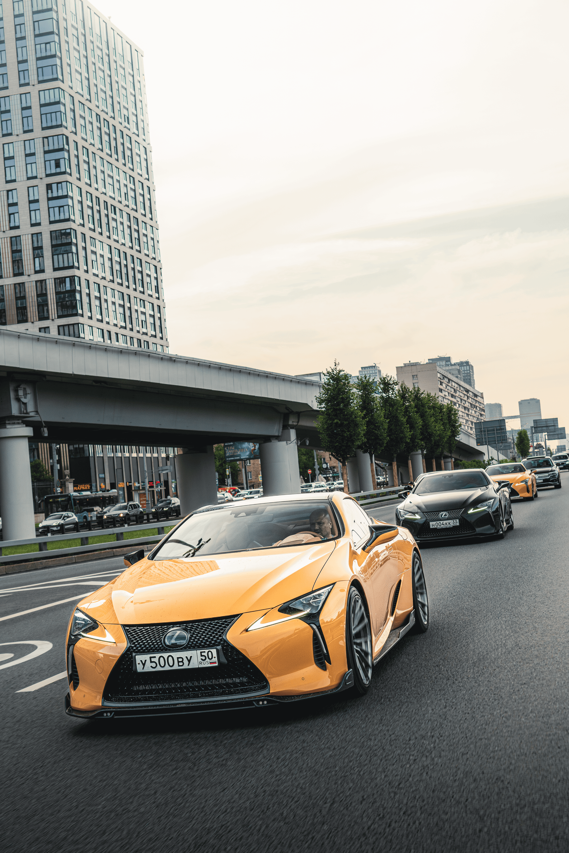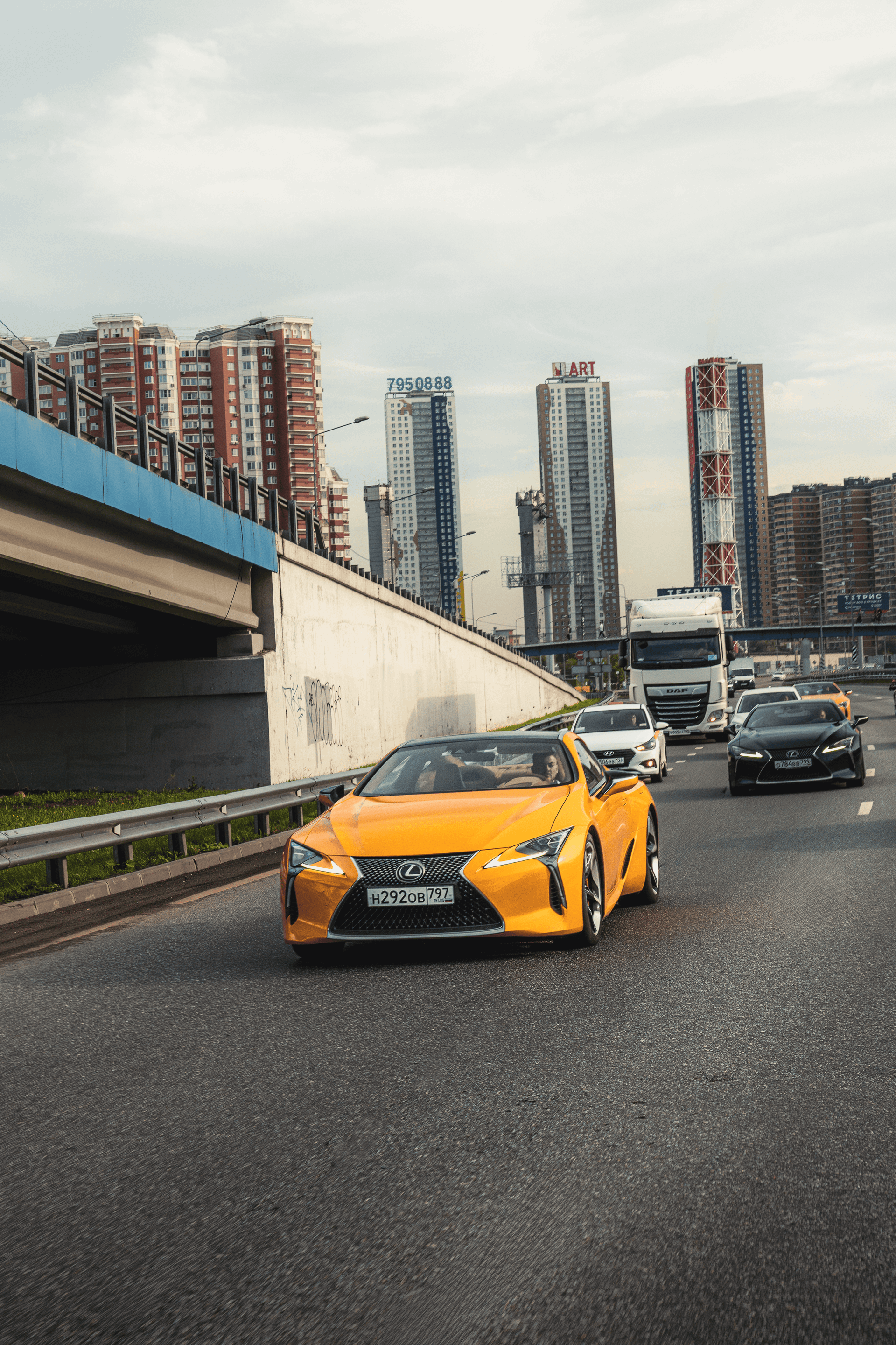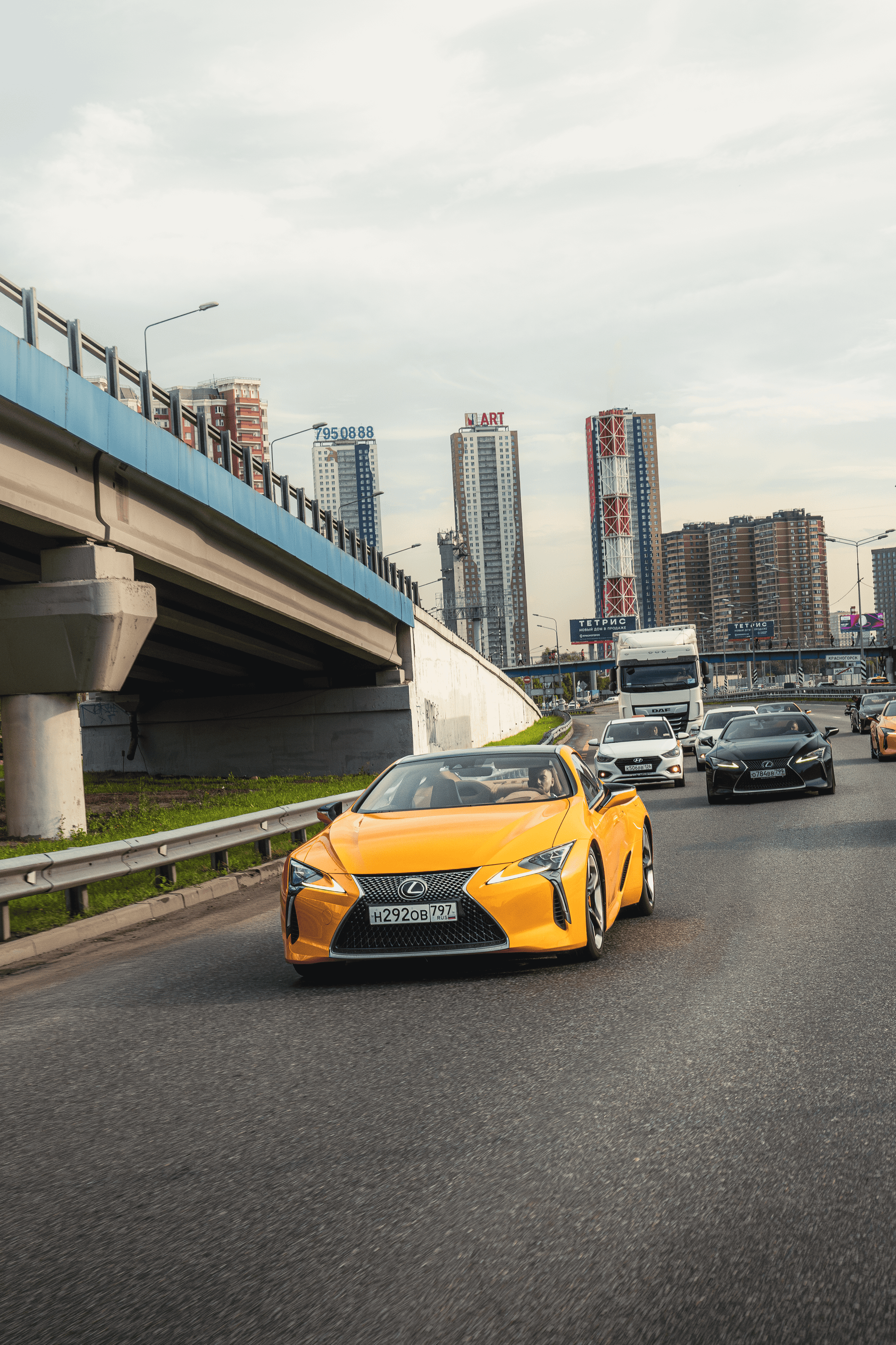 Именно здесь у меня получилось максимально красиво сфотографировать экземпляр, который мне понравился больше всех — жёлтый LC500 с обвесом от фирмы TOM'S, нештатным выхлопом, а также красивейшей стенс-посадкой. На фоне остальных автомобилей, оставшихся в заводском исполнении (кроме черного Lexus из Владимира), этот, на мой взгляд, выглядит максимально необычно.