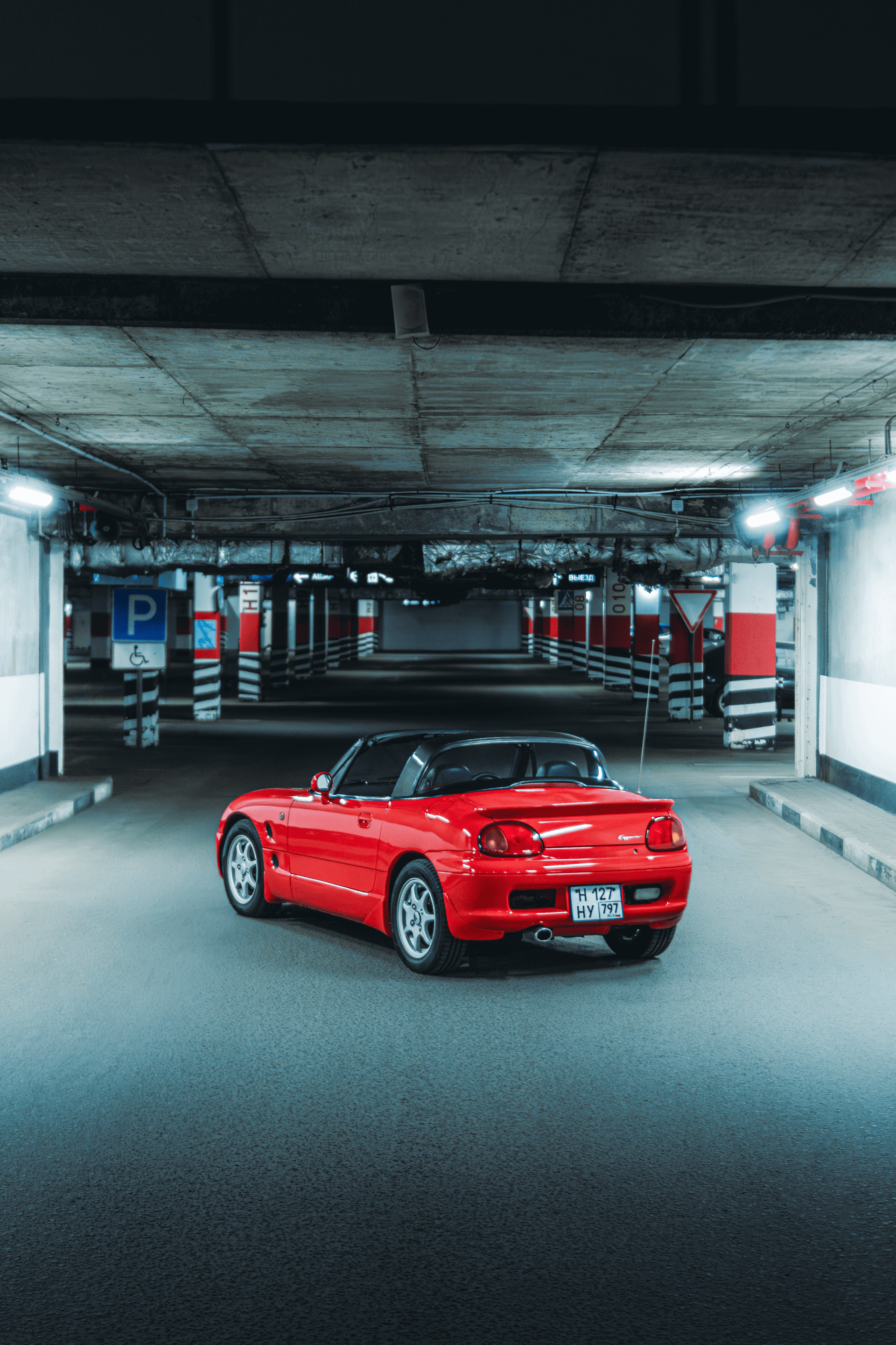 Так как до основного мероприятия оставалось еще достаточно времени, мы решили пройтись по всей парковке в поисках других интересных локаций. Так, спустившись на этаж ниже, мы нашли очень светлый проезд внутренней парковки ТЦ, где и решили по максимуму осмотреть и отфотографировать эту машинку.